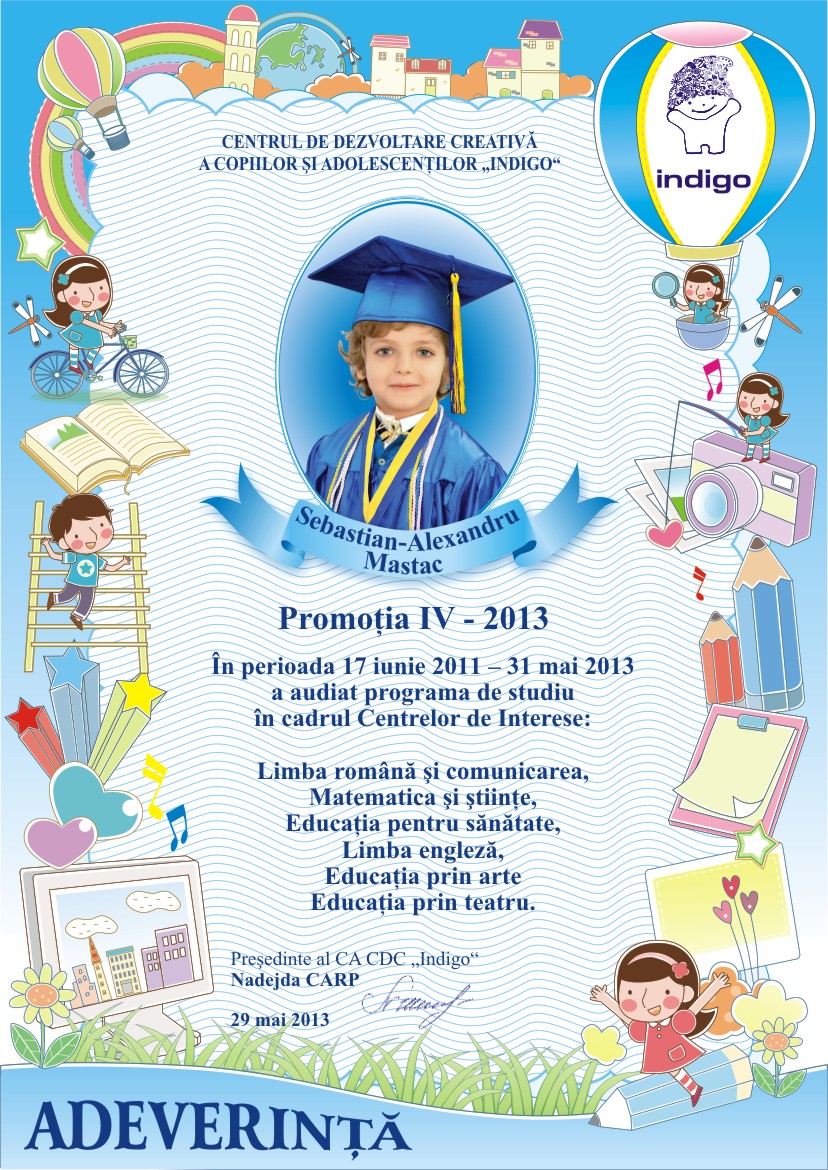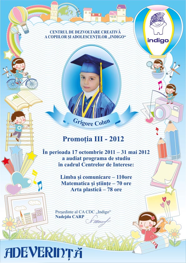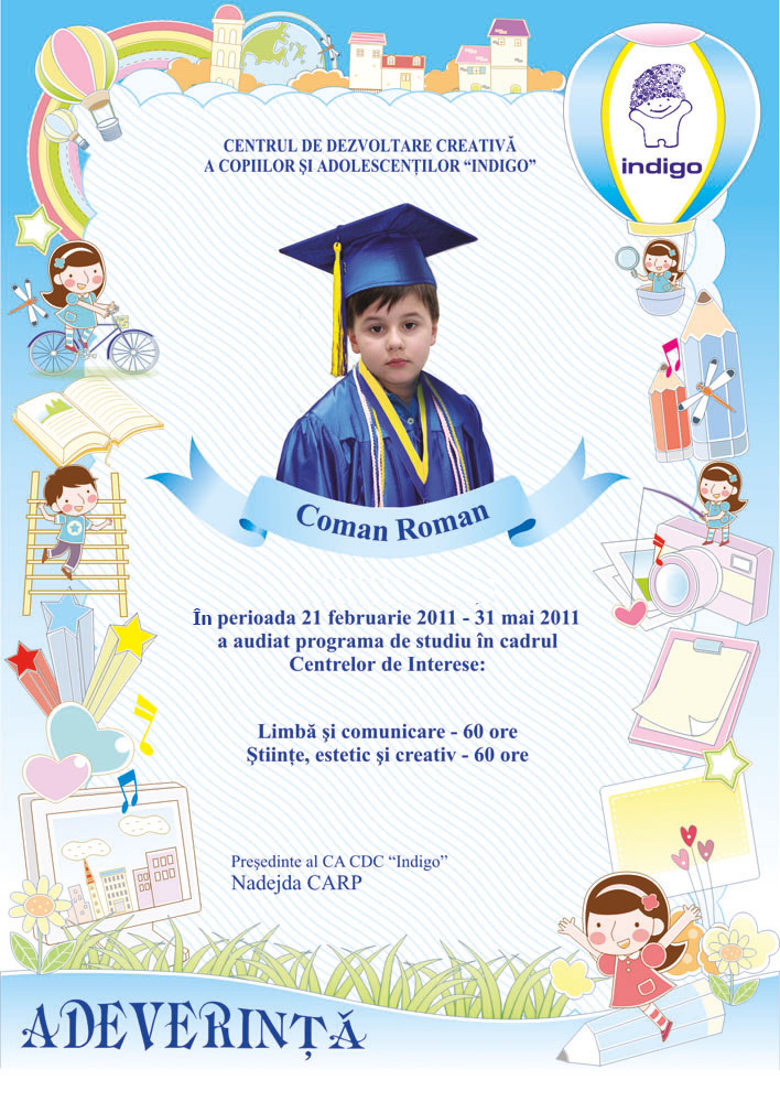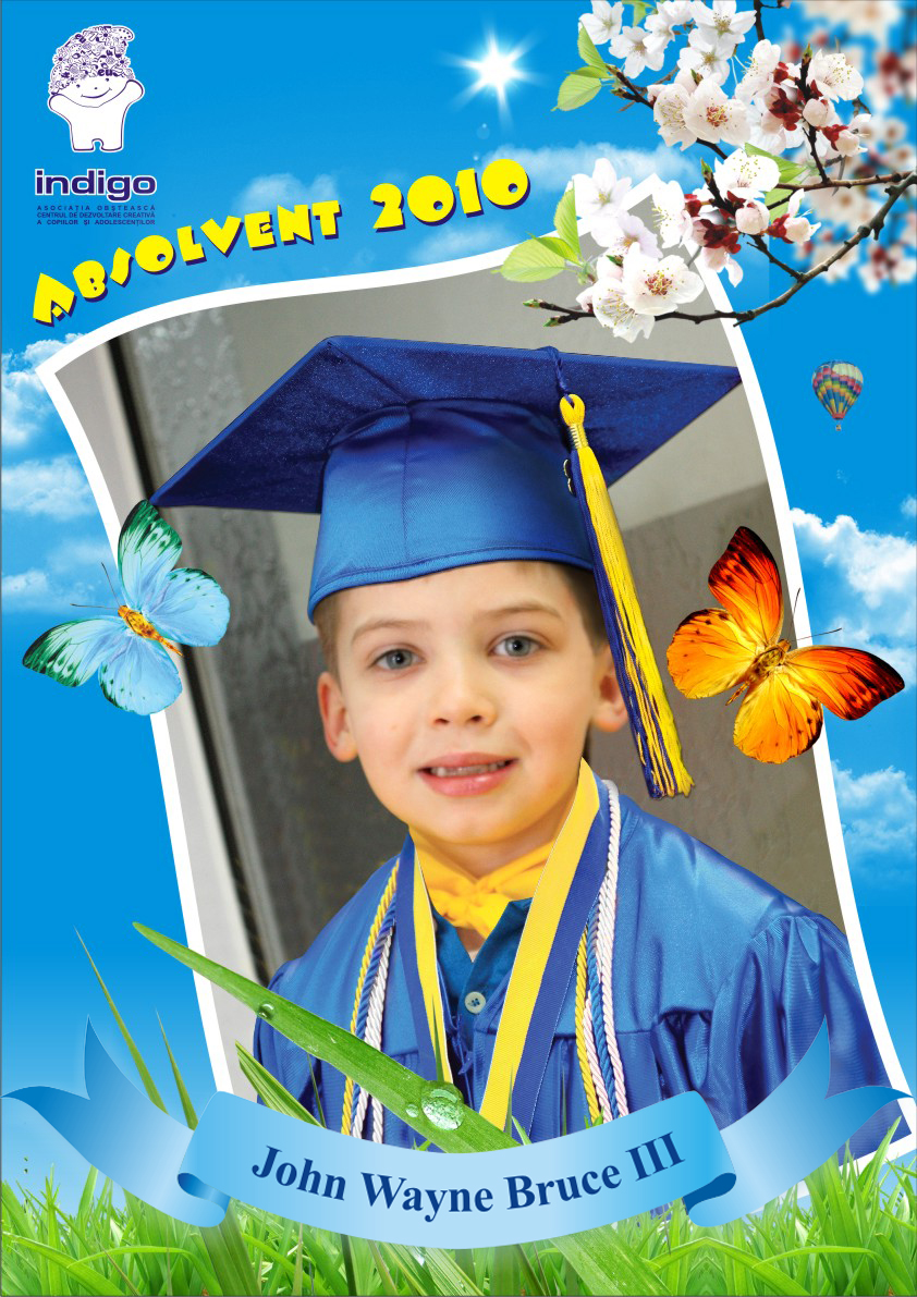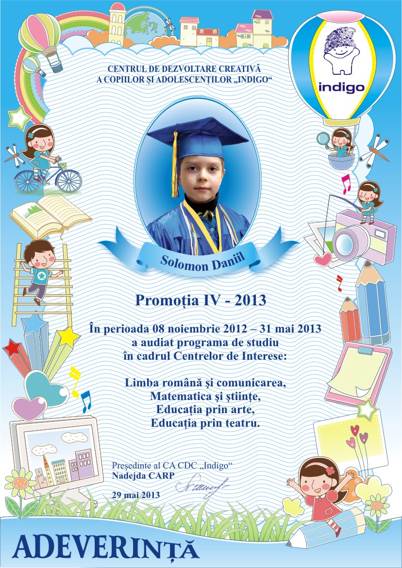 Astazi este si ziua cind tu ai devenit absolvent al Centrului de Dezvoltare Creativa a Copiilor si Adolescentilor „Indigo”. Aici ai invatat multe lucruri frumoase, care cu siguranta iti vor fi utile la liceu. Iti dorim sa fii si in viitor la fel de ingenios, creativ si indraznet precum te cunoastem noi.