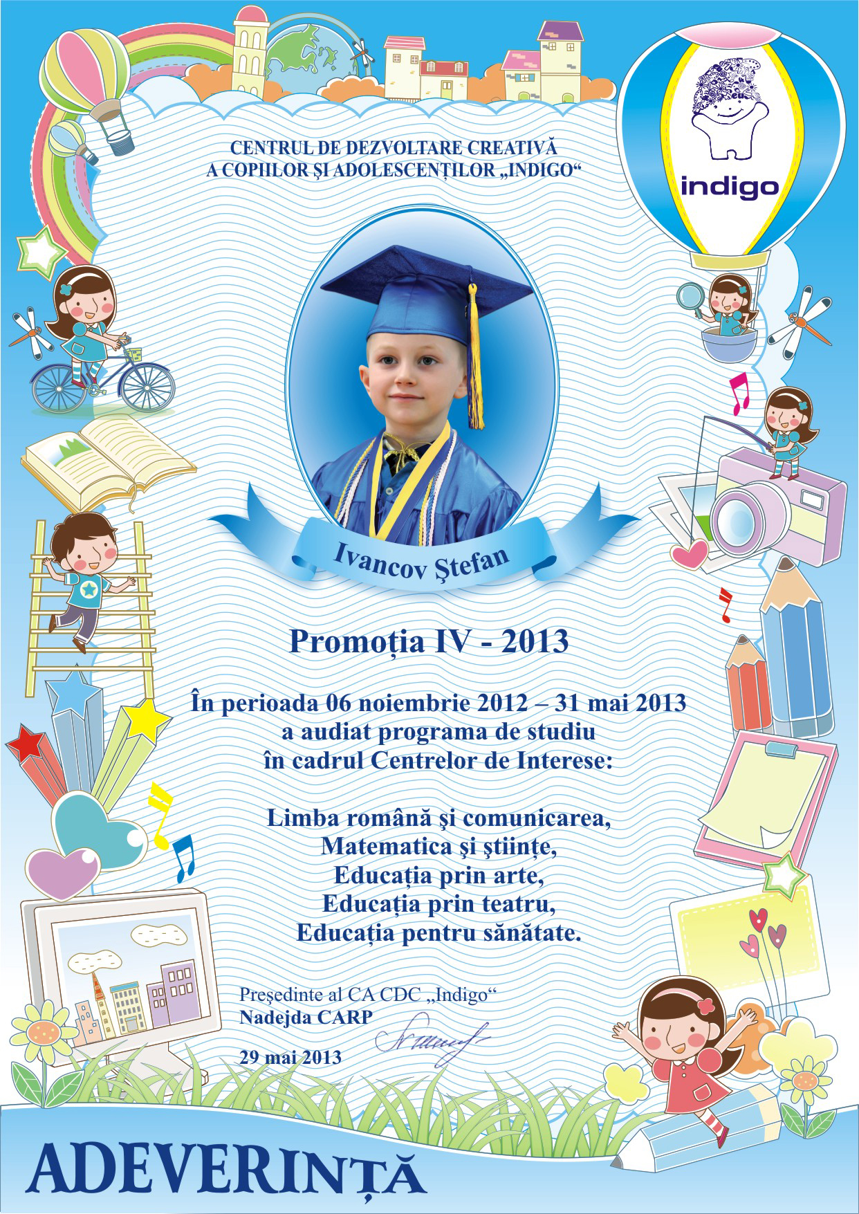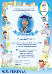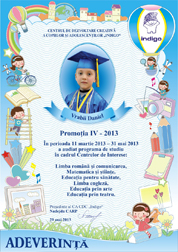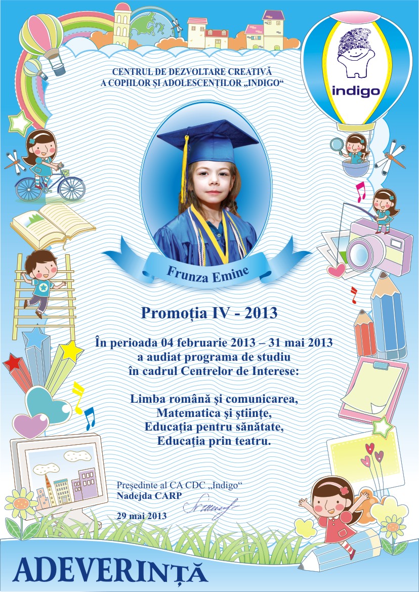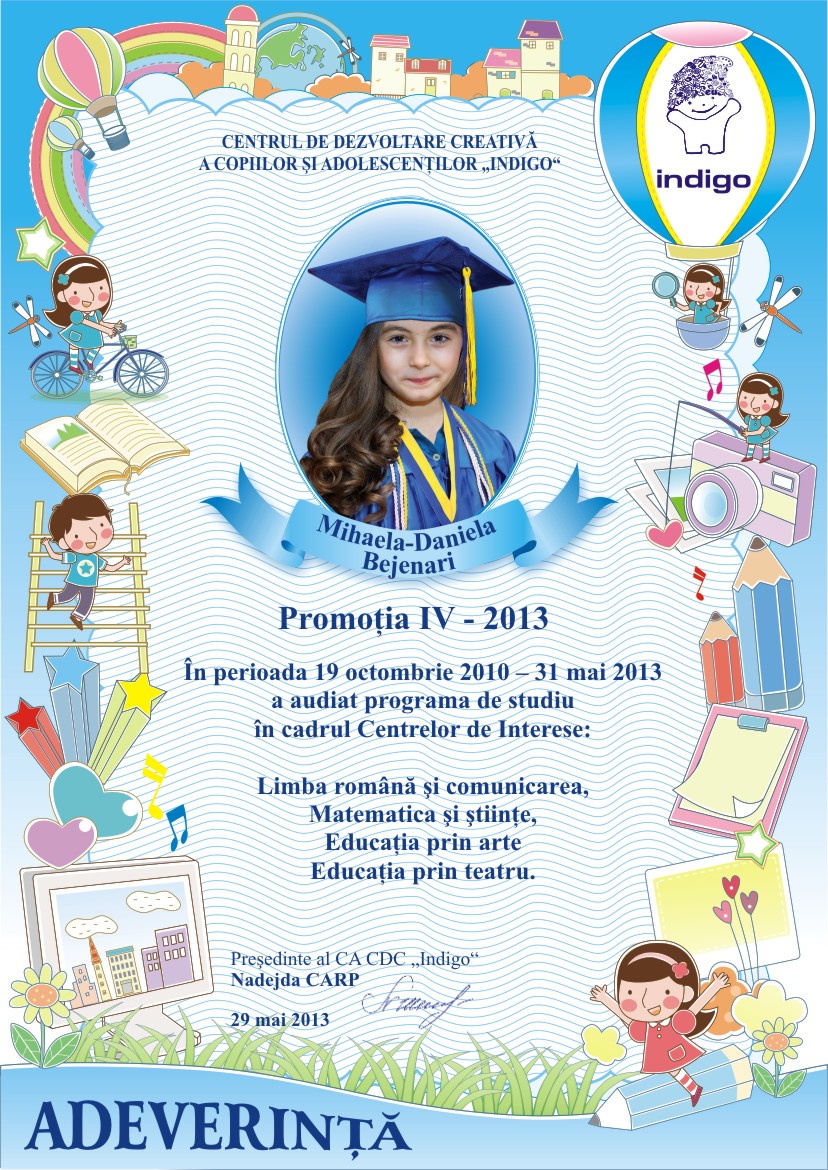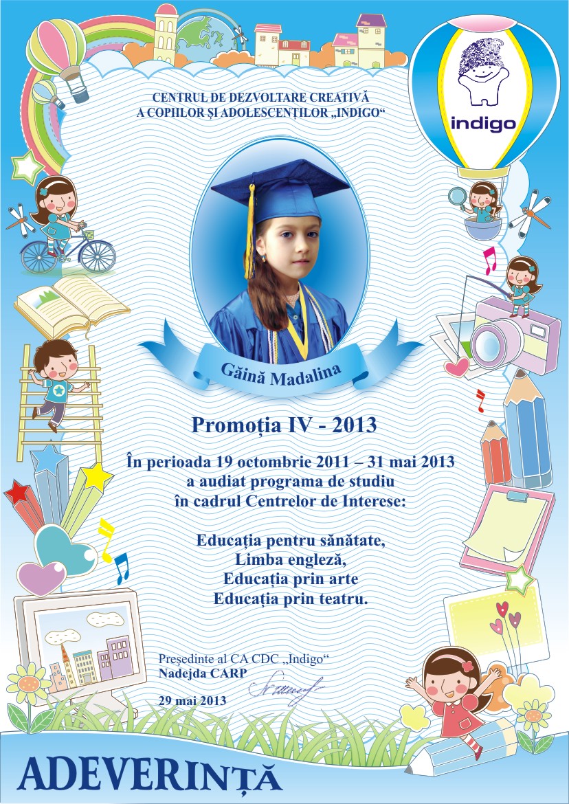 Astazi este si ziua cind tu ai devenit absolvent al Centrului de Dezvoltare Creativa a Copiilor si Adolescentilor „Indigo”. Aici ai invatat multe lucruri frumoase, care cu siguranta iti vor fi utile la liceu. Iti dorim sa fii si in viitor la fel de ingenios, creativ si indraznet precum te cunoastem noi.