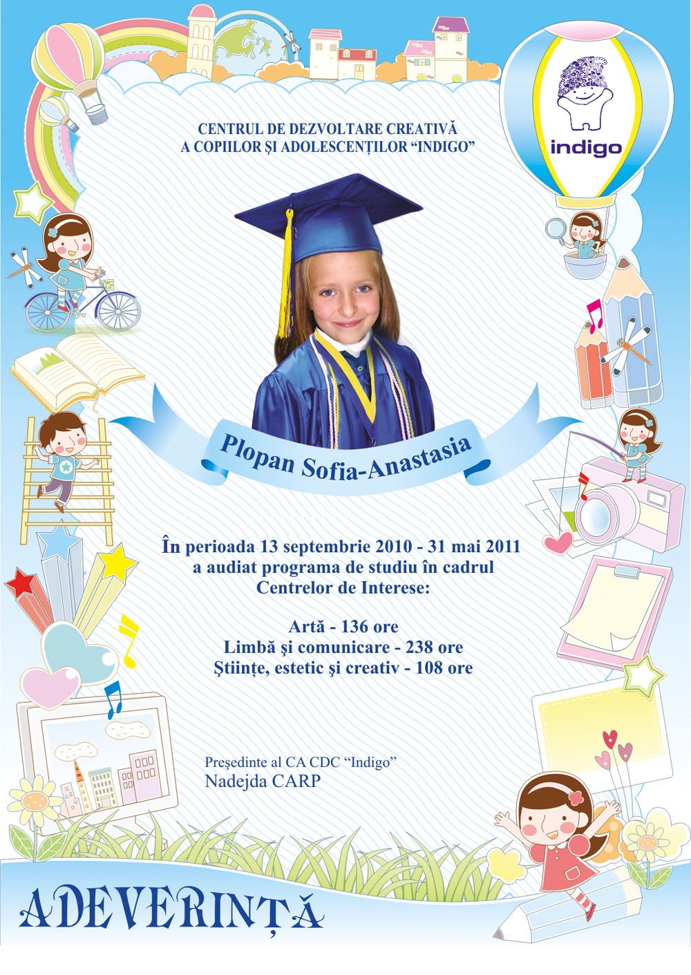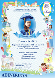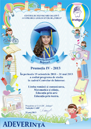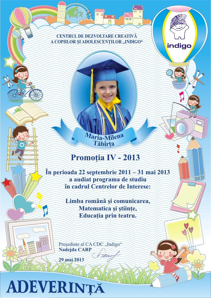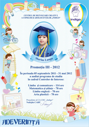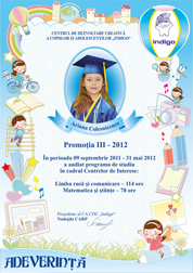 Sa pasesti cu dreptul in clasa intii si sa stii ca oricind te asteptam cu drag la CDC „Indigo”. Calauza in Tara Cunostintelor sa-ti fie povatuitorul vers al poetului Vasile Romanciuc: