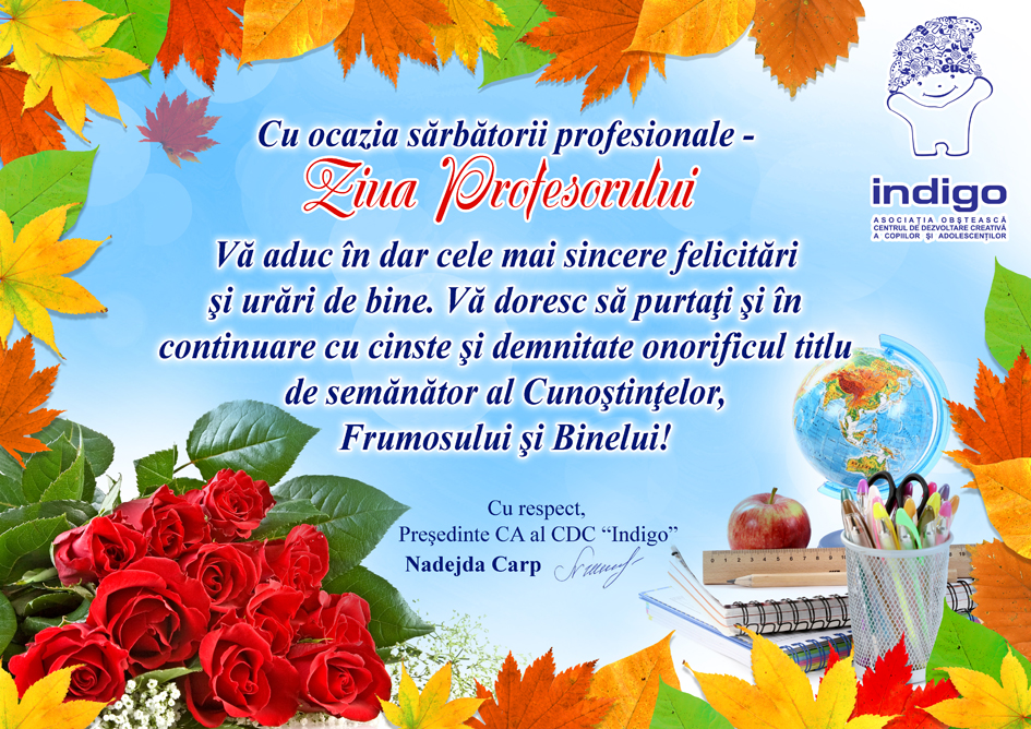 Cea mai inalta apreciete pentru un profesor este recunostinta discipolilor, dar si a parintilor pentru performantele copiilor sai. Aceasta recunostinta poate fi exprimata diferit, dar o scrisoare din suflet, asemenea acesteia, confirma atit gradul inalt de profesionalism, cit si frumoasele calitati umane care va definesc personalitatea.